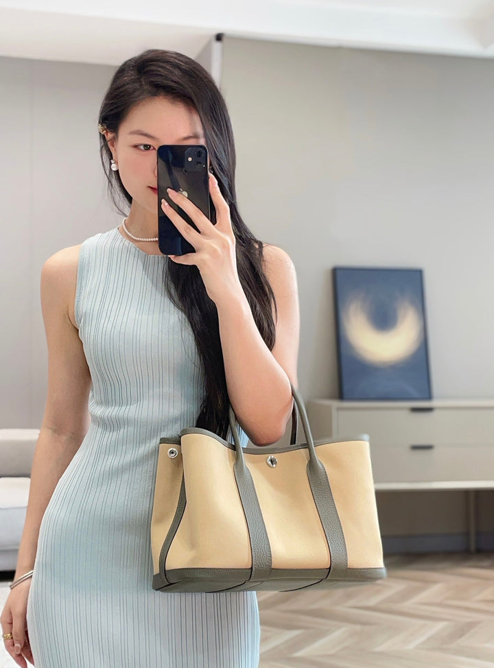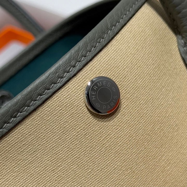 GARDEN PARTY 30CM IN DARK BEIGE TOILETS COTTON CANVAS AND GREY CALFSKIN