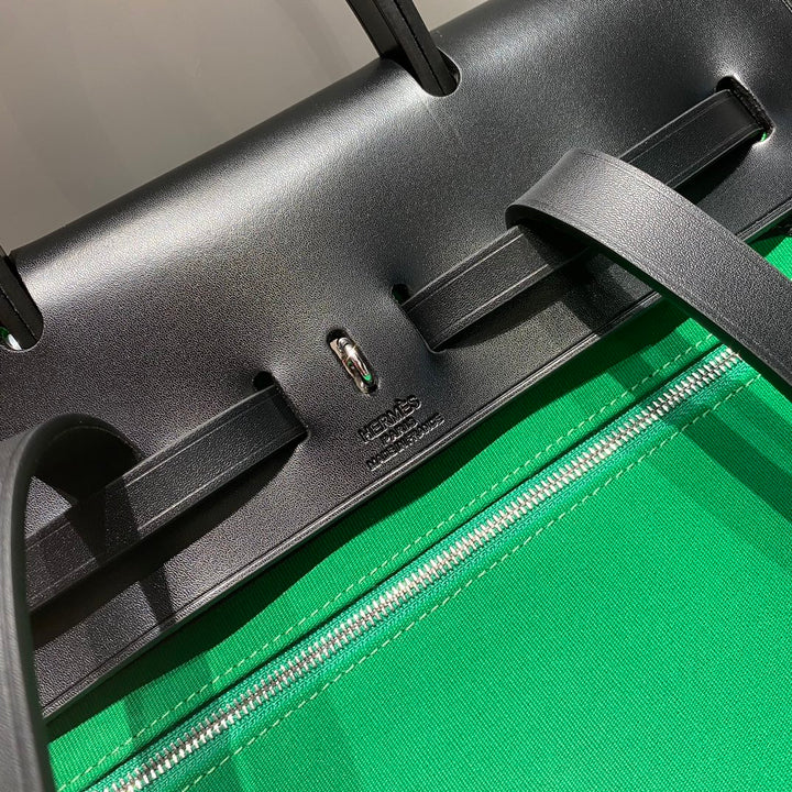 HERBAG A DOS ZIP RETOURNE BACKPACK 29 IN GREEN CANVAS AND BLACK CALFSKIN
